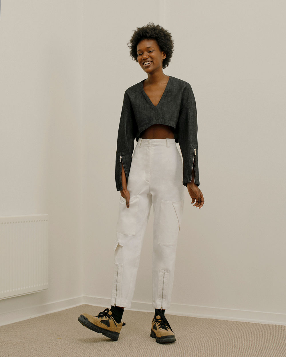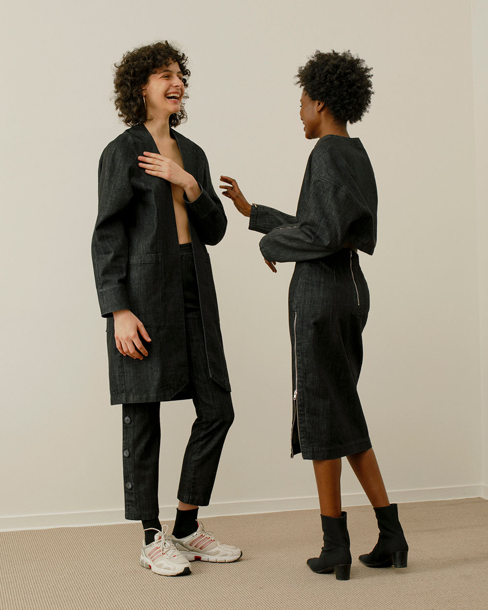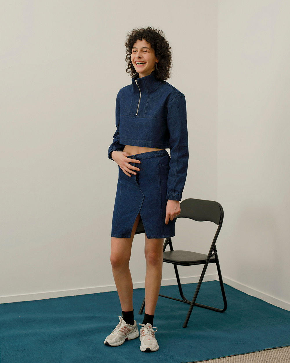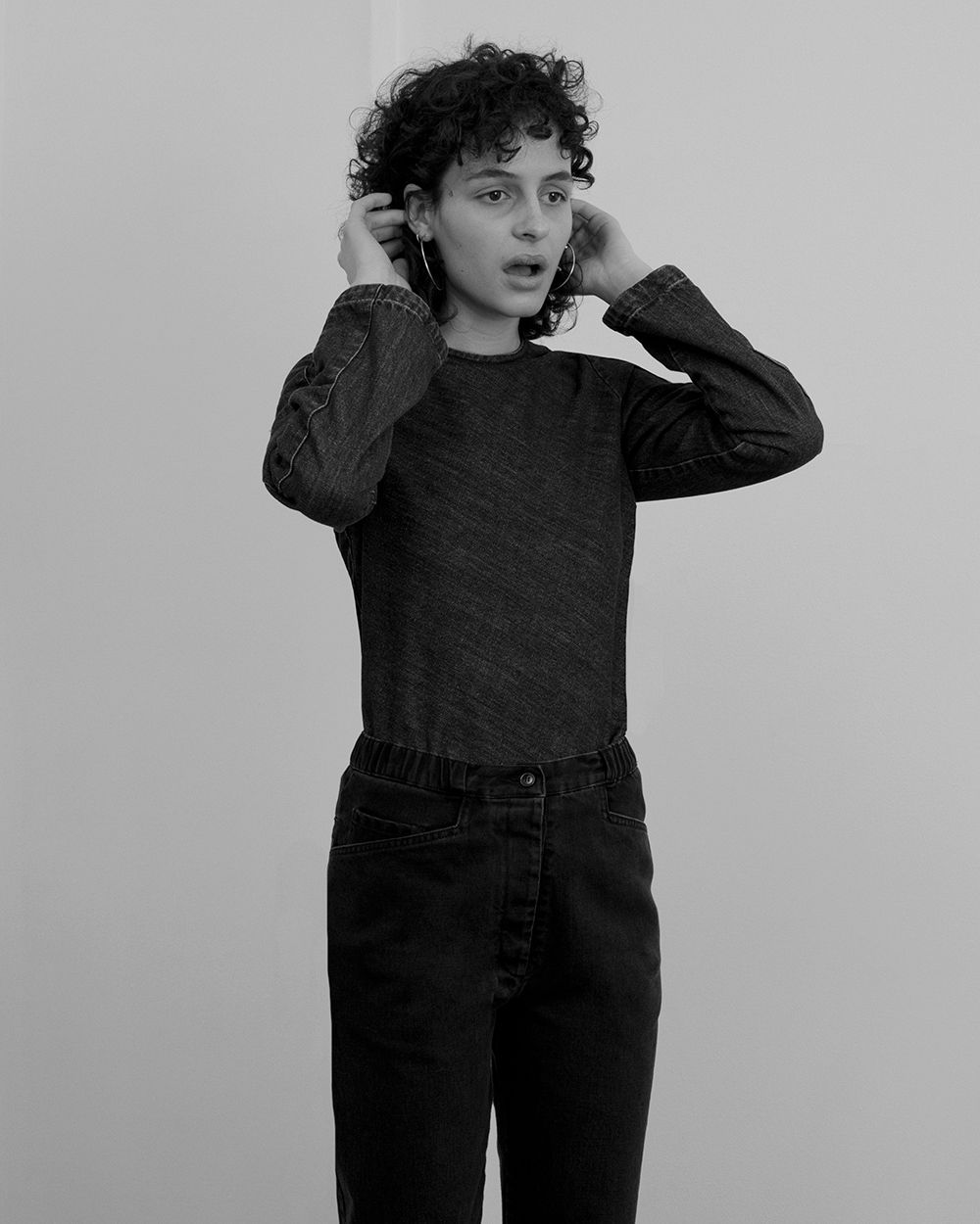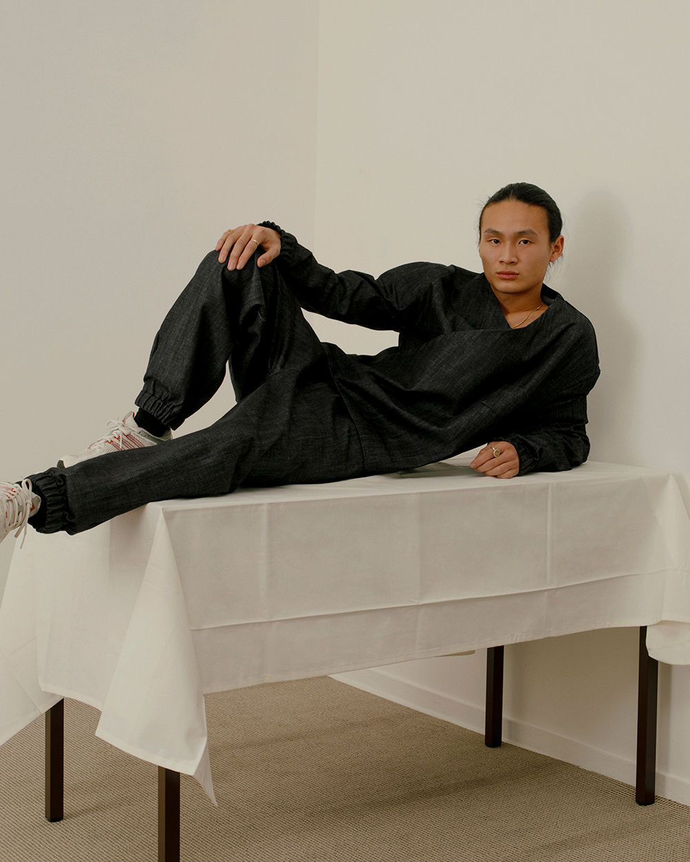 13 Bonaparte really likes to collaborate with young photographers for its Le Denim campaigns. They gave me carte blanche, so I could really do what I wanted and try to balance our two different universes. I recreated an empty apartment because any new collection is also kind of a new beginning. I’m always looking to play with what is usually considered mundane. So, the set is very minimal—just a carpet and a table and chair—but there’s also that fun sense of nostalgia that you get whenever you start something new.