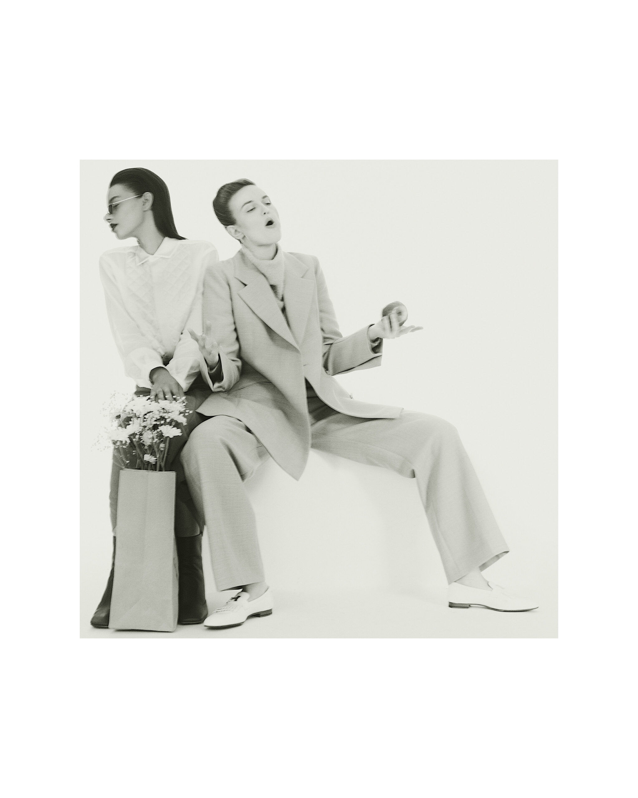 Samara wears a blouse by Bottega Veneta, a skirt by Maison Simons, boots by Fendi and eyewear by Andy Wolf. Madison wears a sweater and suit by COS and shoes by Hermès.