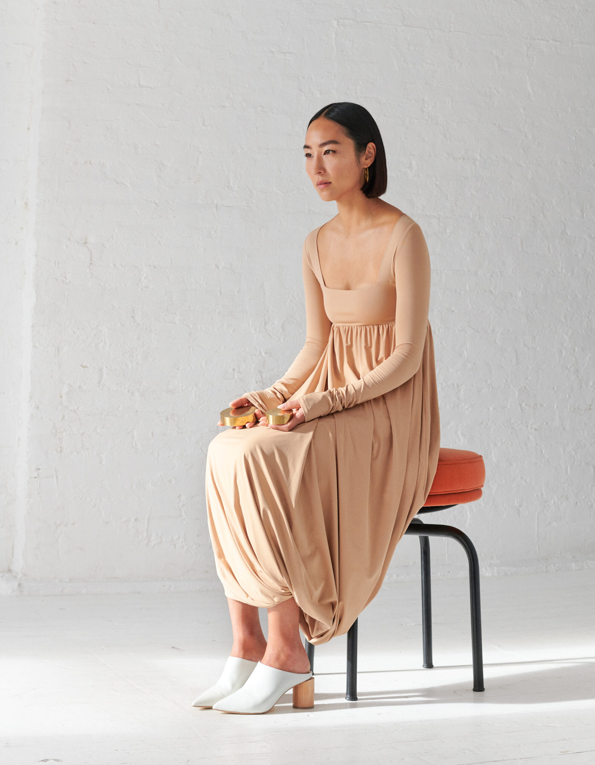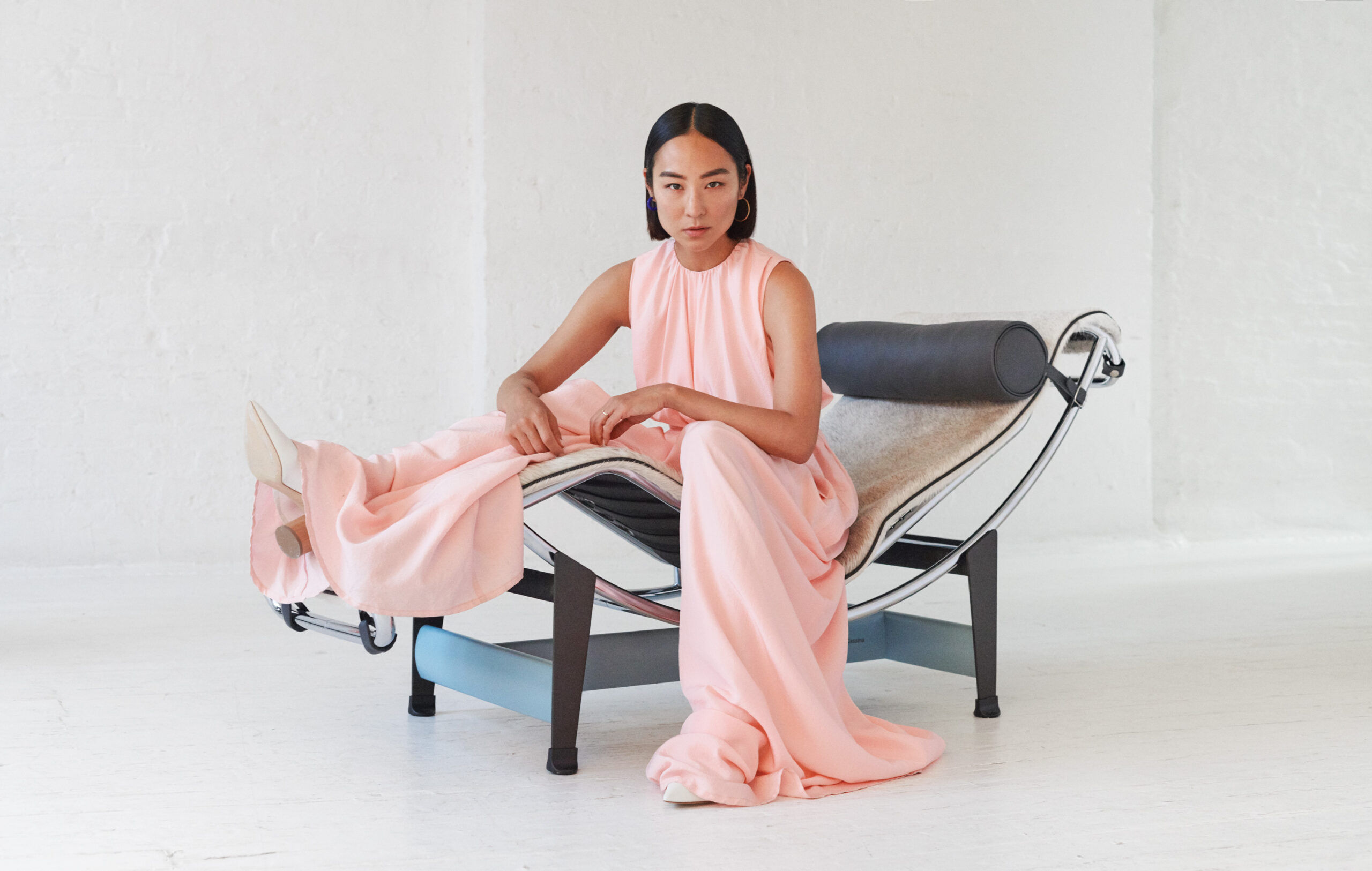 Lee wears a dress by Moon Choi and mules by Christian Wijnants. Chair: LC8 by Charlotte Perriand from Cassina.