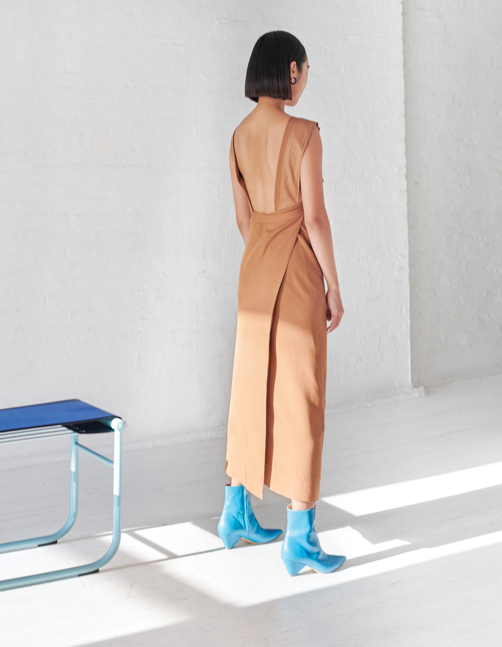 Lee wears a dress by COS and boots by Christian Wijnants. Chair: LC9 by Charlotte Perriand from Cassina. All earrings by A.P.C.