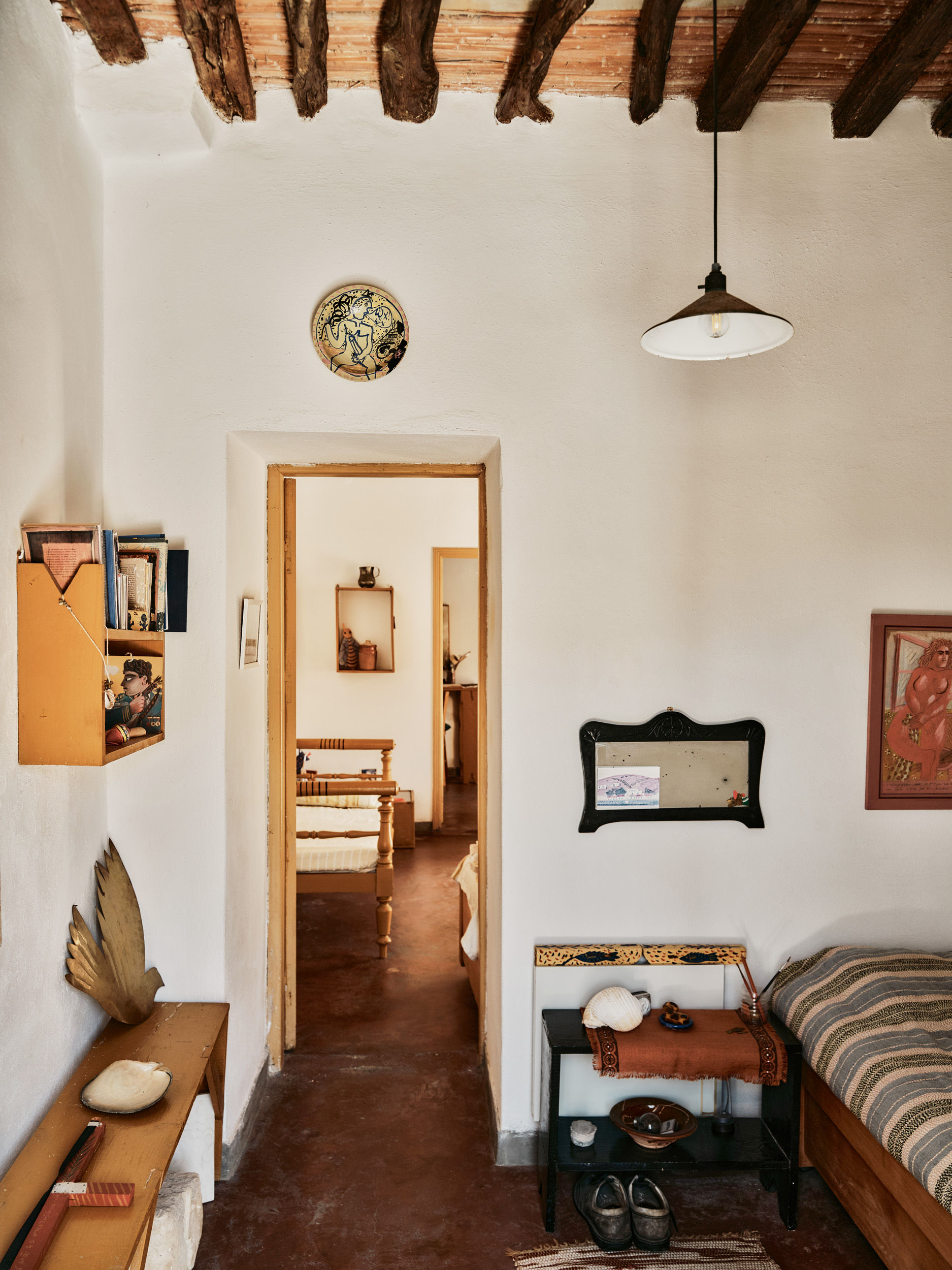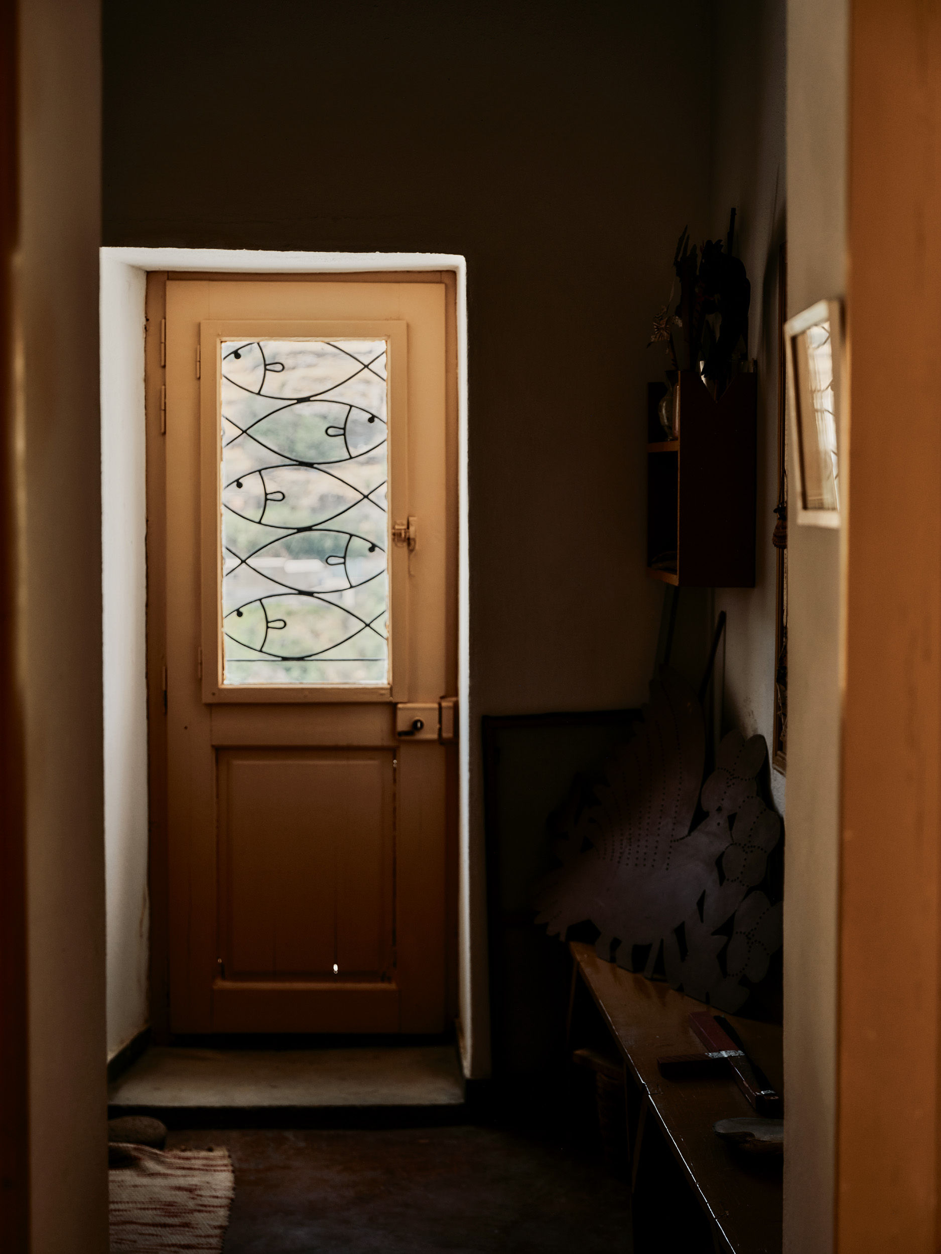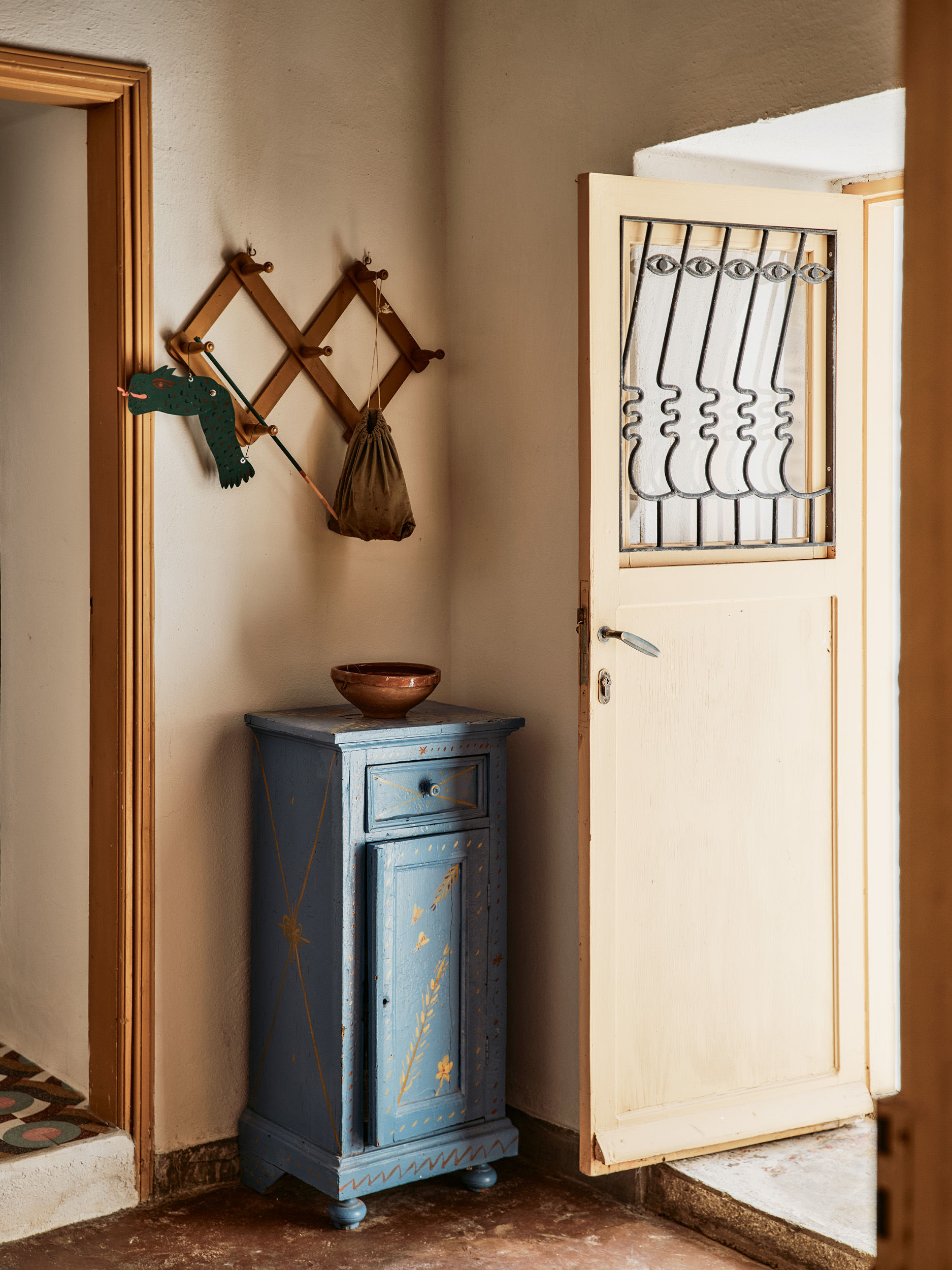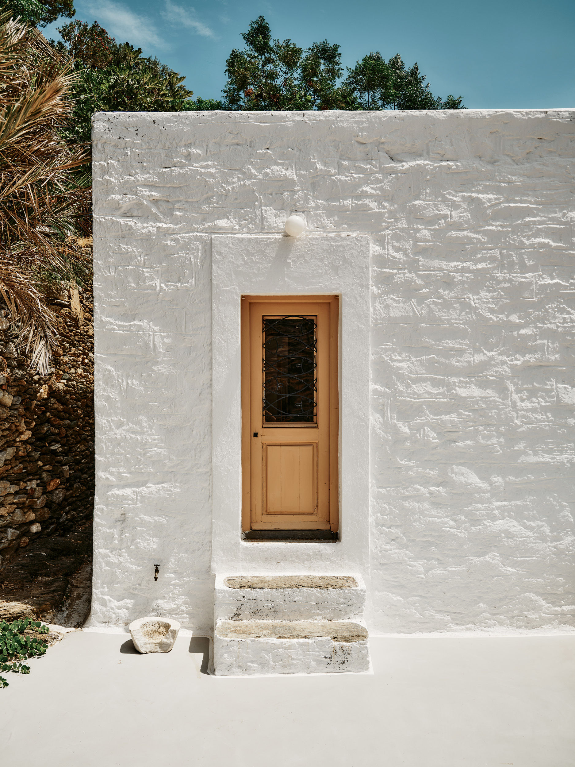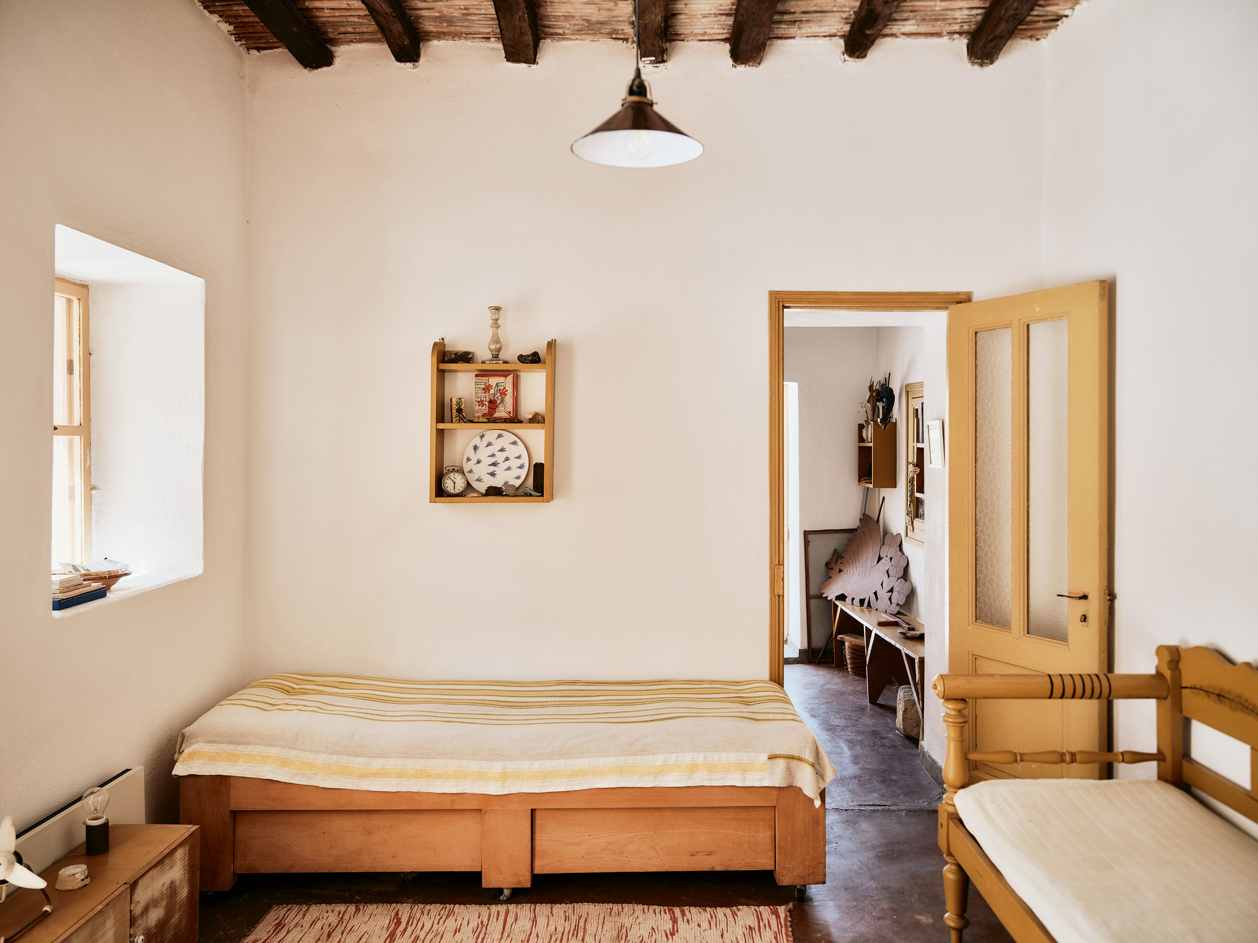 Over the decades, Fassianos kept interventions to a minimum, wanting to maintain the identity and simplicity of the house’s architecture. He resisted the addition of roof tiles, a feature foreign to the island but adopted by many as a convenient substitute for the traditional flat roofs built of wood and earth. The matrix of branches and reed that still line the ceiling only add to the house’s character. It was with equal fervor he searched for and applied traditional colors on doorframes and shutters, and he took care to maintain the original flooring.