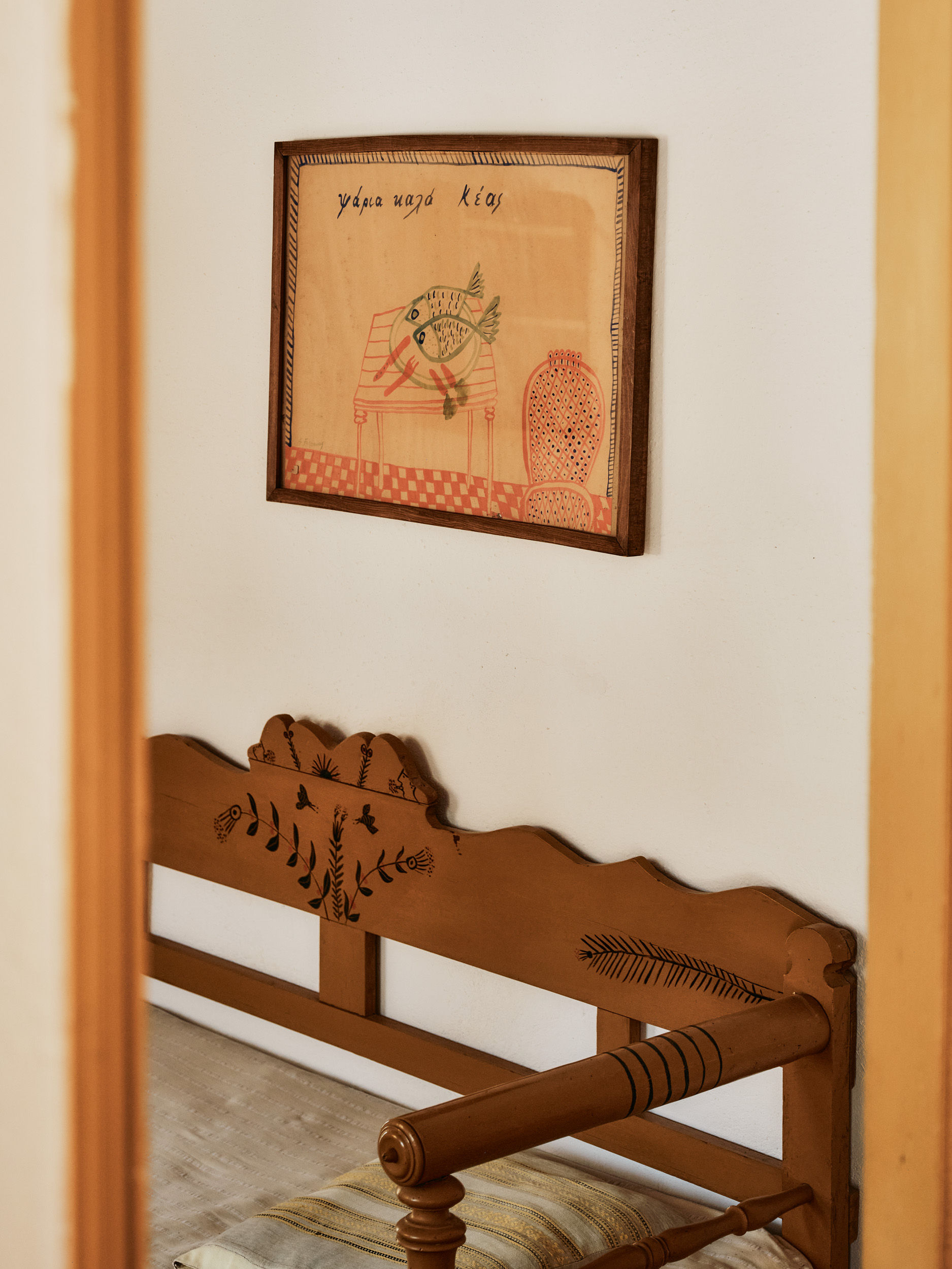 A shadow-theater dragon hangs by the door, which Fassianos painted ocher in tribute to the colors of Kea. The dragon motif was recently reimagined as a brass table lamp by Swedish design house Svenskt Tenn, part of a collection of homewares honoring Fassianos titled Beneath the Same Sky.