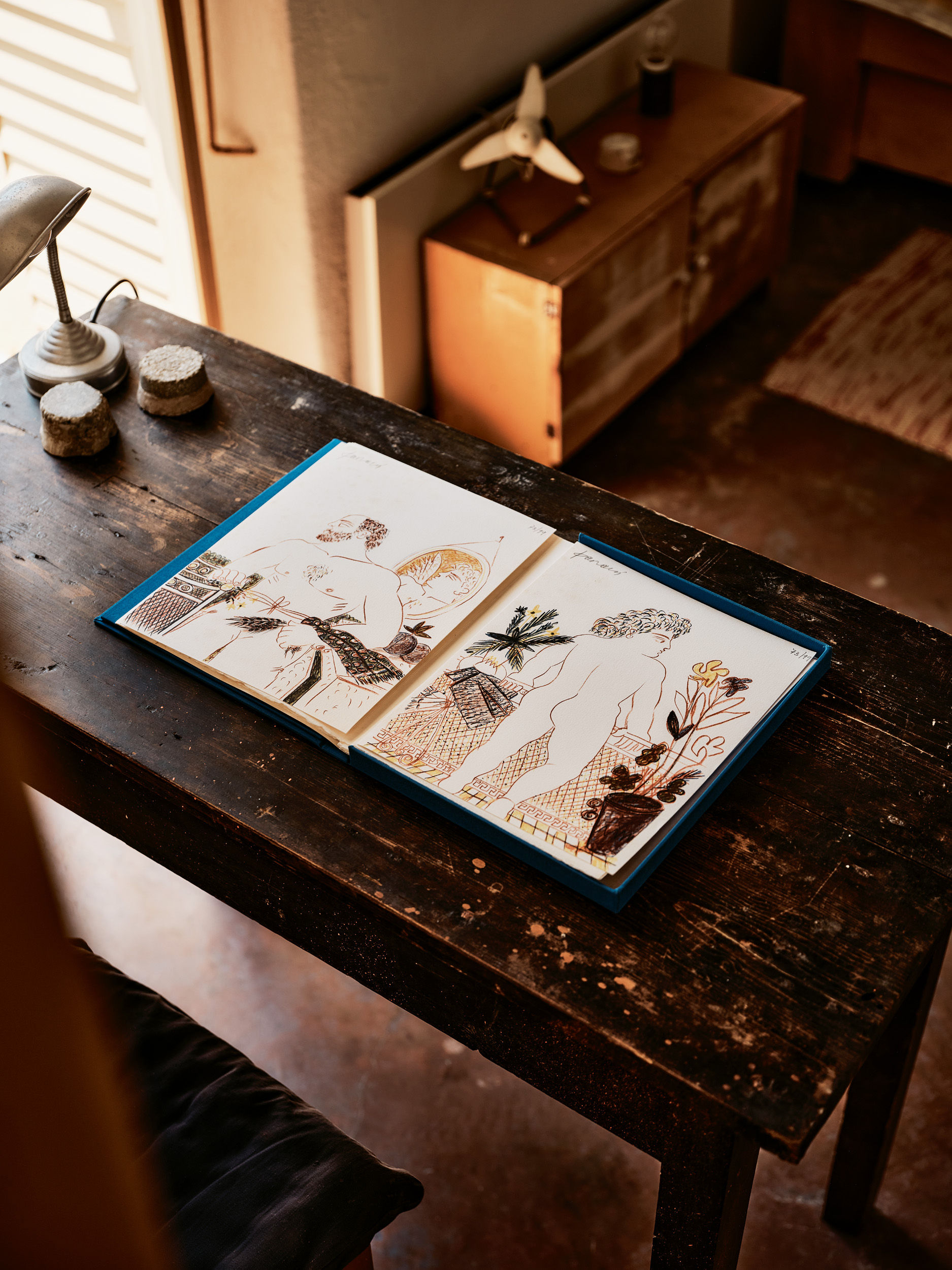 His determination has meant that a remarkable example of Kea’s traditional architecture has been preserved and yet, plain and unassuming, the house offers a quiet backdrop for the countless works and artifacts that populate it to this day. As Theodora Patiti, an artist from Kea who works for the Fassianos estate, explains, nothing in the house was curated to create a particular narrative after his death. Instead, most items have remained exactly where Fassianos left them: the painted desk, where he drew; the notes to friends, scrawled on planks because the house had no telephone line—acts of fidelity more than conservation.