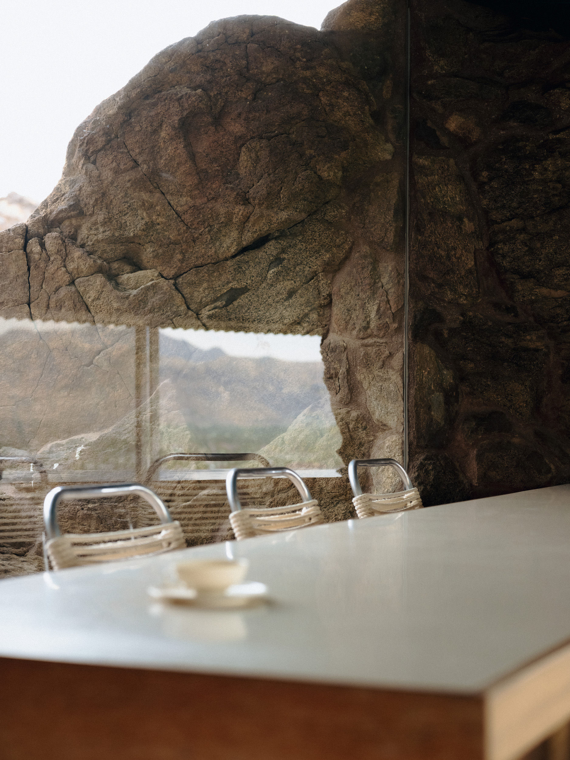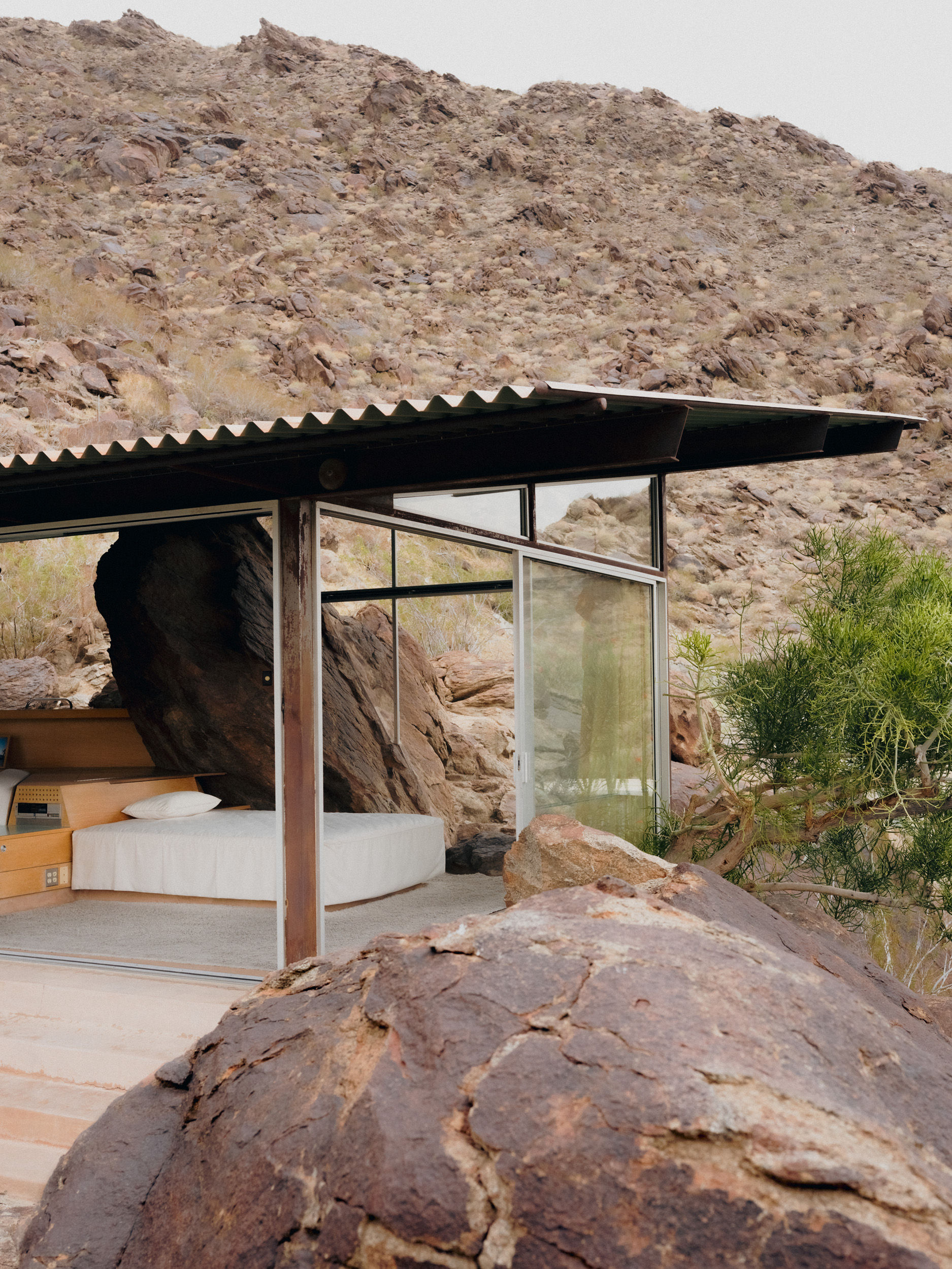 The San Jacinto Mountains rise abruptly from the floor of the Southern California desert, a series of steep rocky slopes in shades of mahogany and tan, their ridgeline jagged against the pure blue sky. Half hidden in the mountainside, about 220 feet up, is Frey House II, the home of Swiss-born architect Albert Frey for more than three decades. Completed in 1964, the house is nearly transparent: a simple glass rectangle with a slanted roof, its steel frame anchored to the landscape by a large granite boulder that protrudes into the house. It’s a curious meeting of the natural world and rational modernism, perched in a serene, otherworldly setting.
