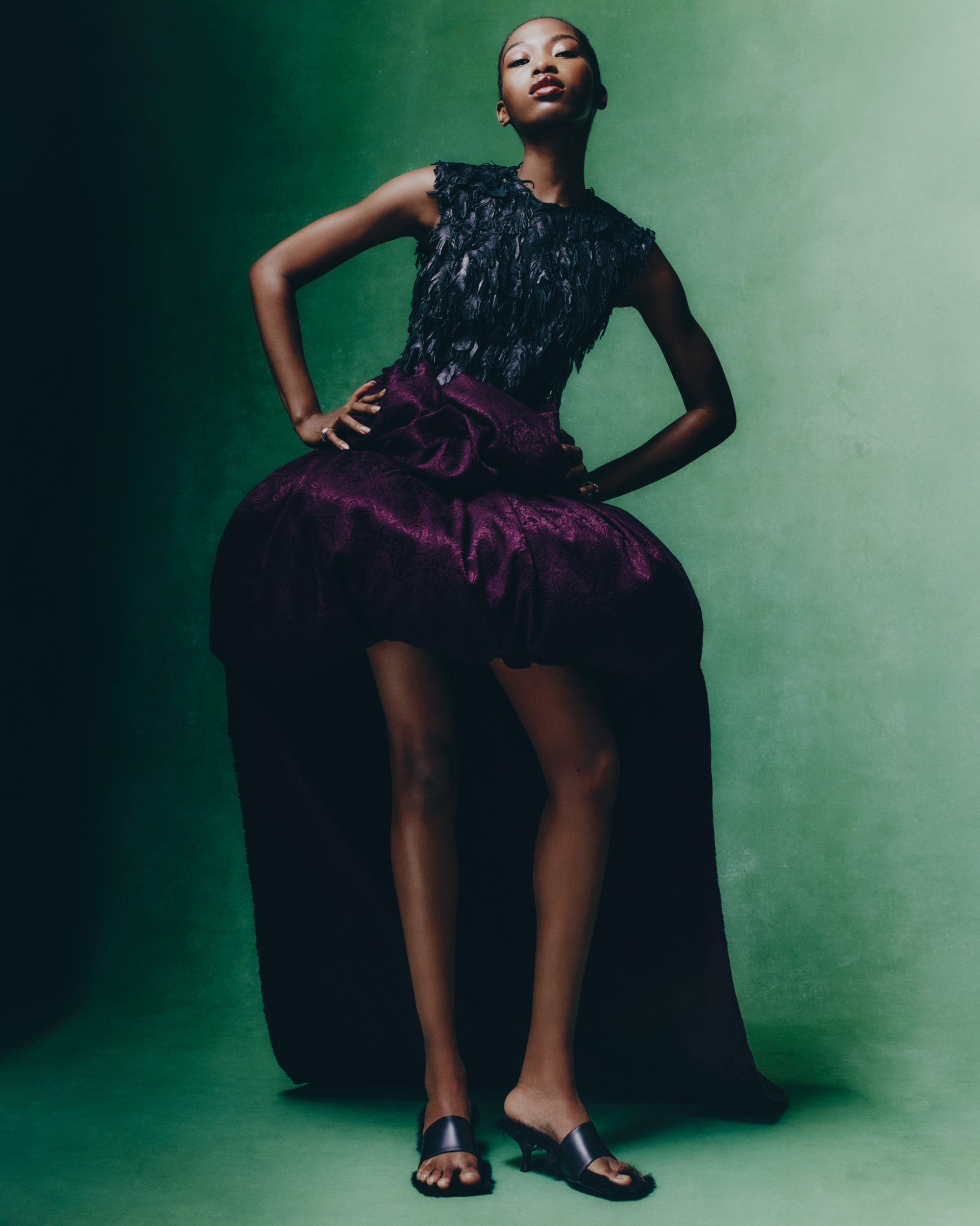 Elysia wears a dress by PHOEBE SCOT and earrings by TOM WOOD. The dress is made from shredded denim and recycled paper.