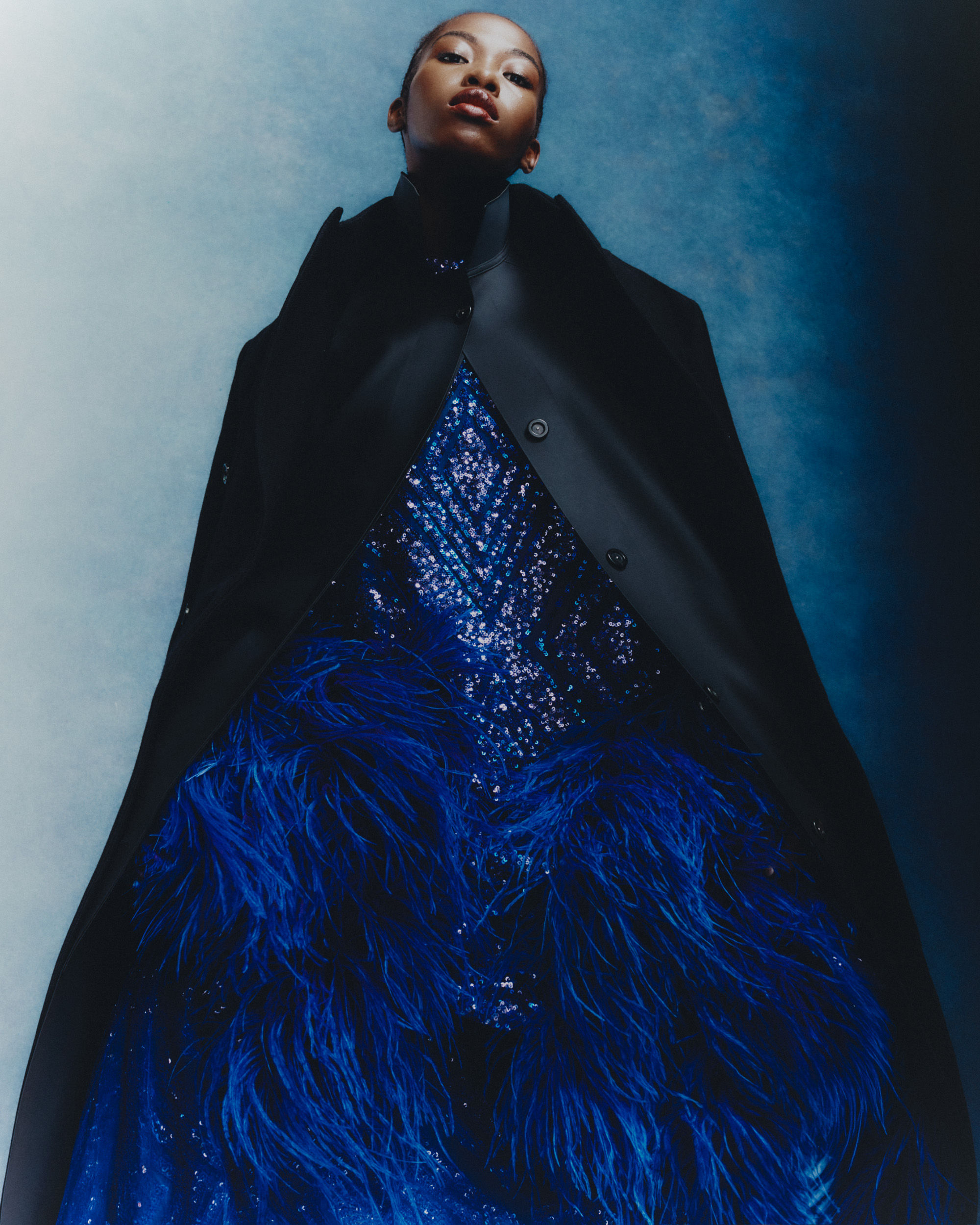 Chizoba wears a dress by TALLER MARMO and coats by KASSL EDITIONS and RÓHE. KASSL EDITIONS are B Corp certified, meaning they meet rigorous social and environmental performance standards.