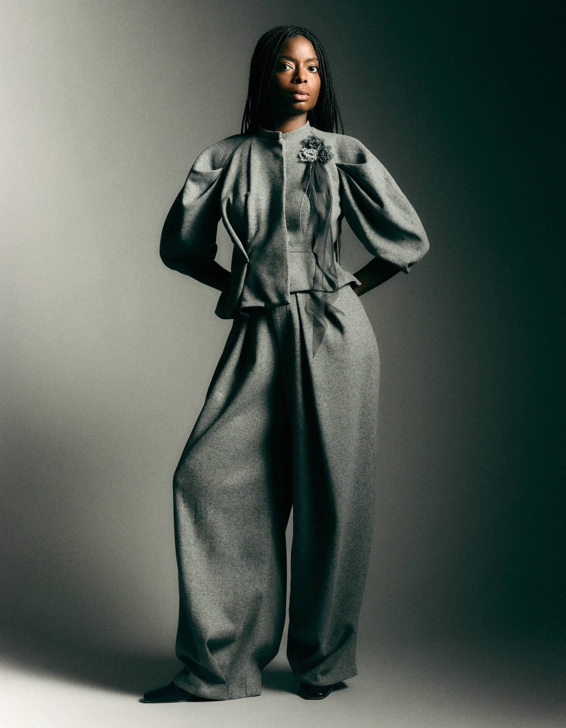 Uwagba wears a suit by PAULINE DUJANCOURT and shoes by TOTEME.