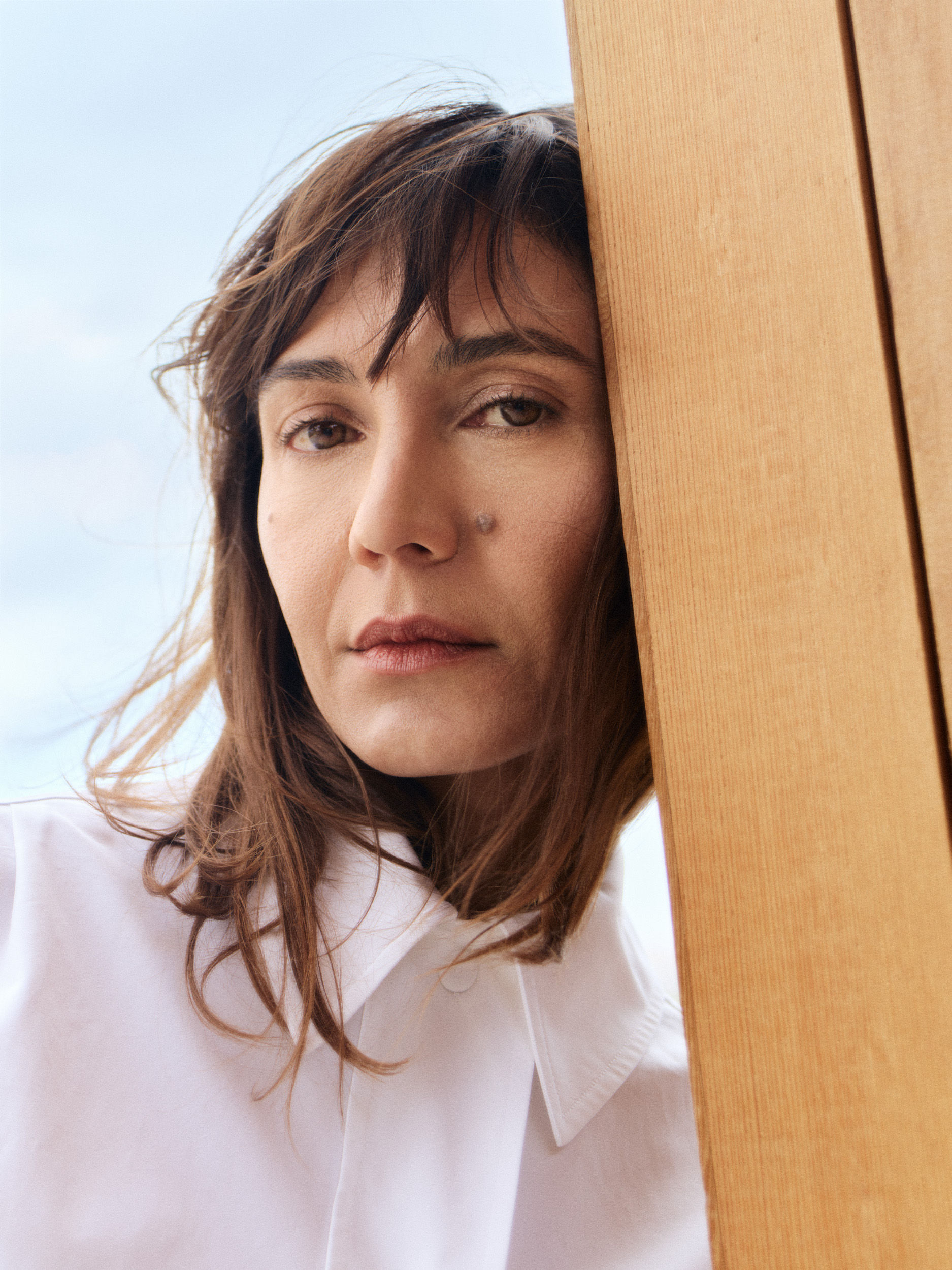 Moshfegh wears a jacket and trousers by JIL SANDER, a bra by FLEUR DU MAL and shoes by THE ROW.