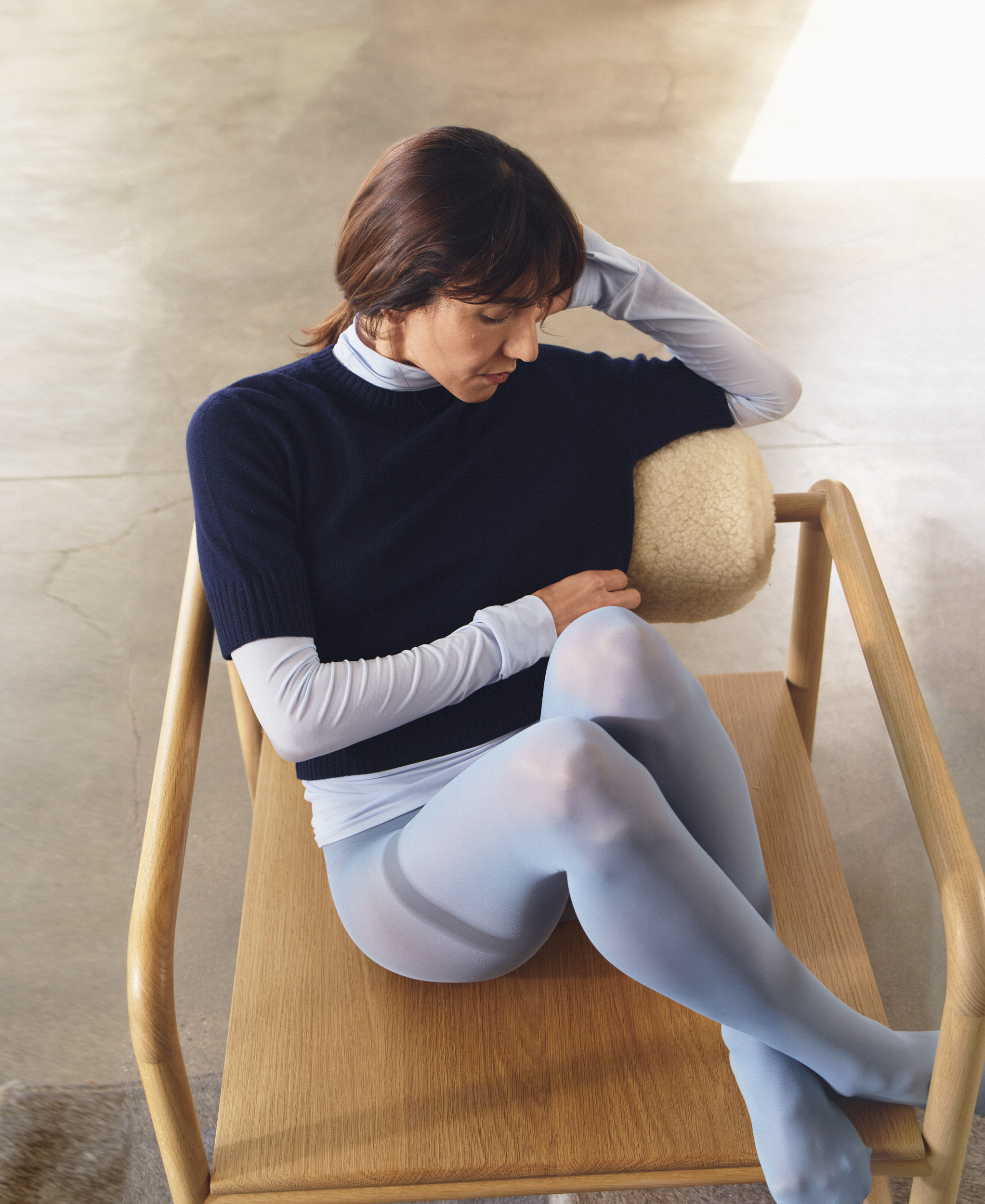 Moshfegh wears a sweater by JIL SANDER, a top by ISSEY MIYAKE and tights by WOLFORD.