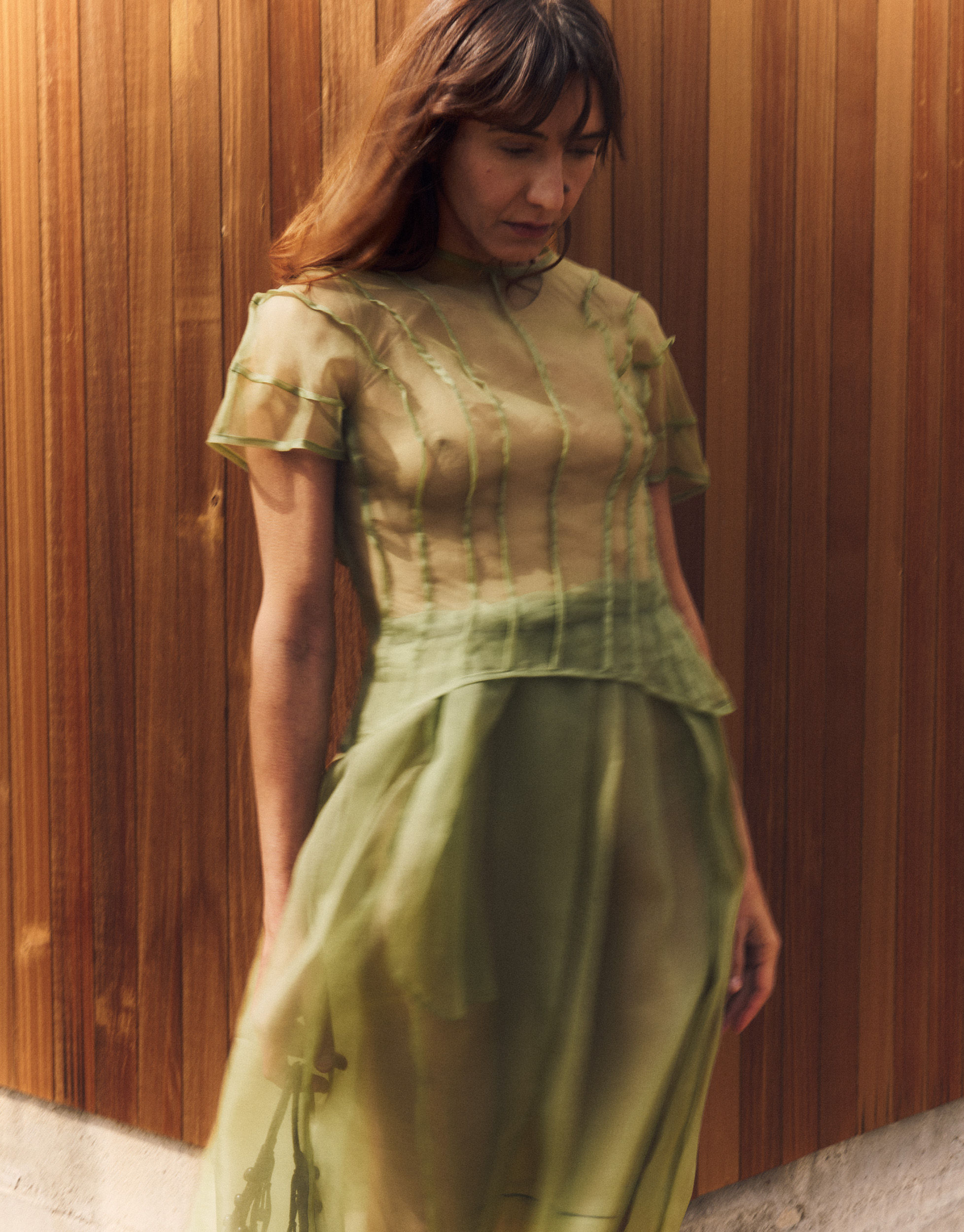 She wears a top and skirt by JIL SANDER and rings by LARA SONMEZ.
