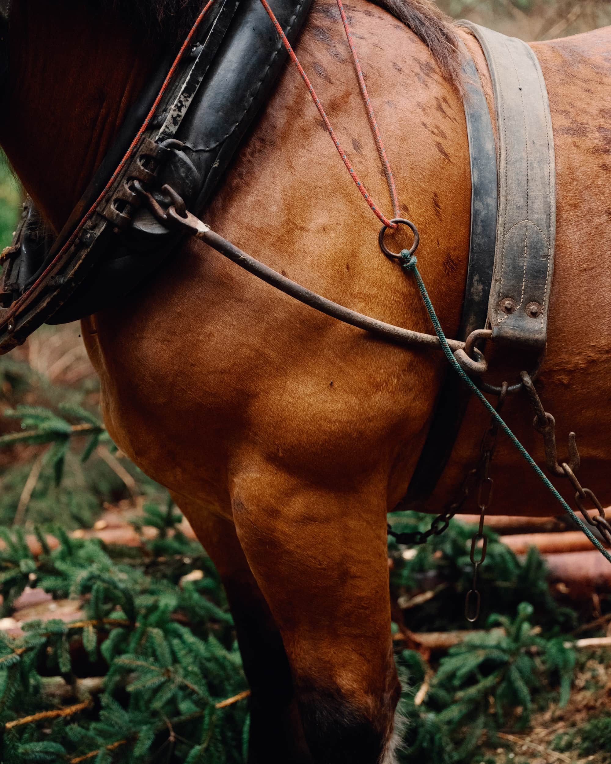 The sturdy front legs of an Ardennais horse, one of the oldest European breeds. In this region of the Ardennes, the horses are still deployed for farm work and heavy drafting, such as logging.