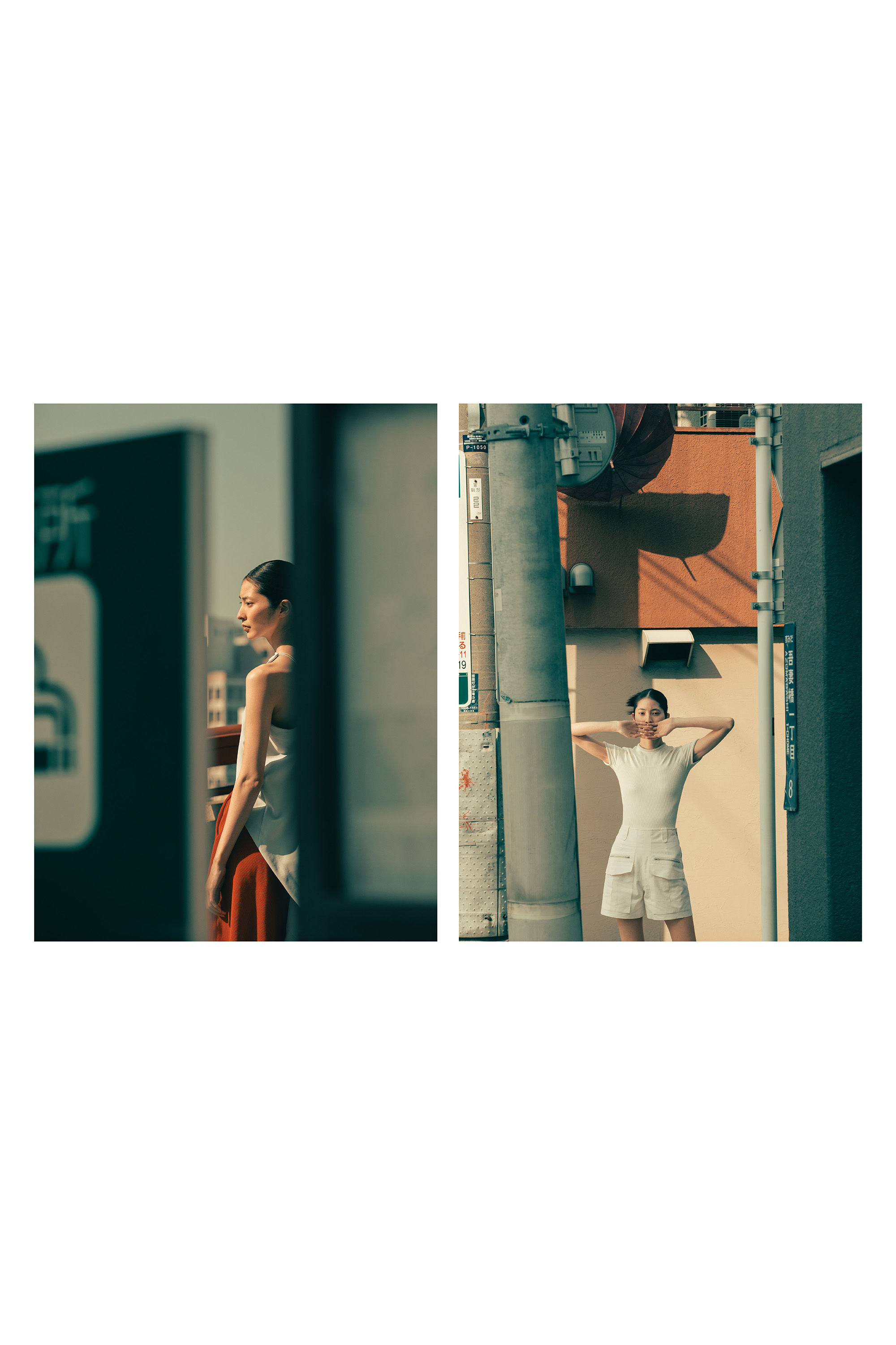 Above left: She wears a top by Jens and a skirt by Hyke. Above right: She wears a top and shorts by Hermès.