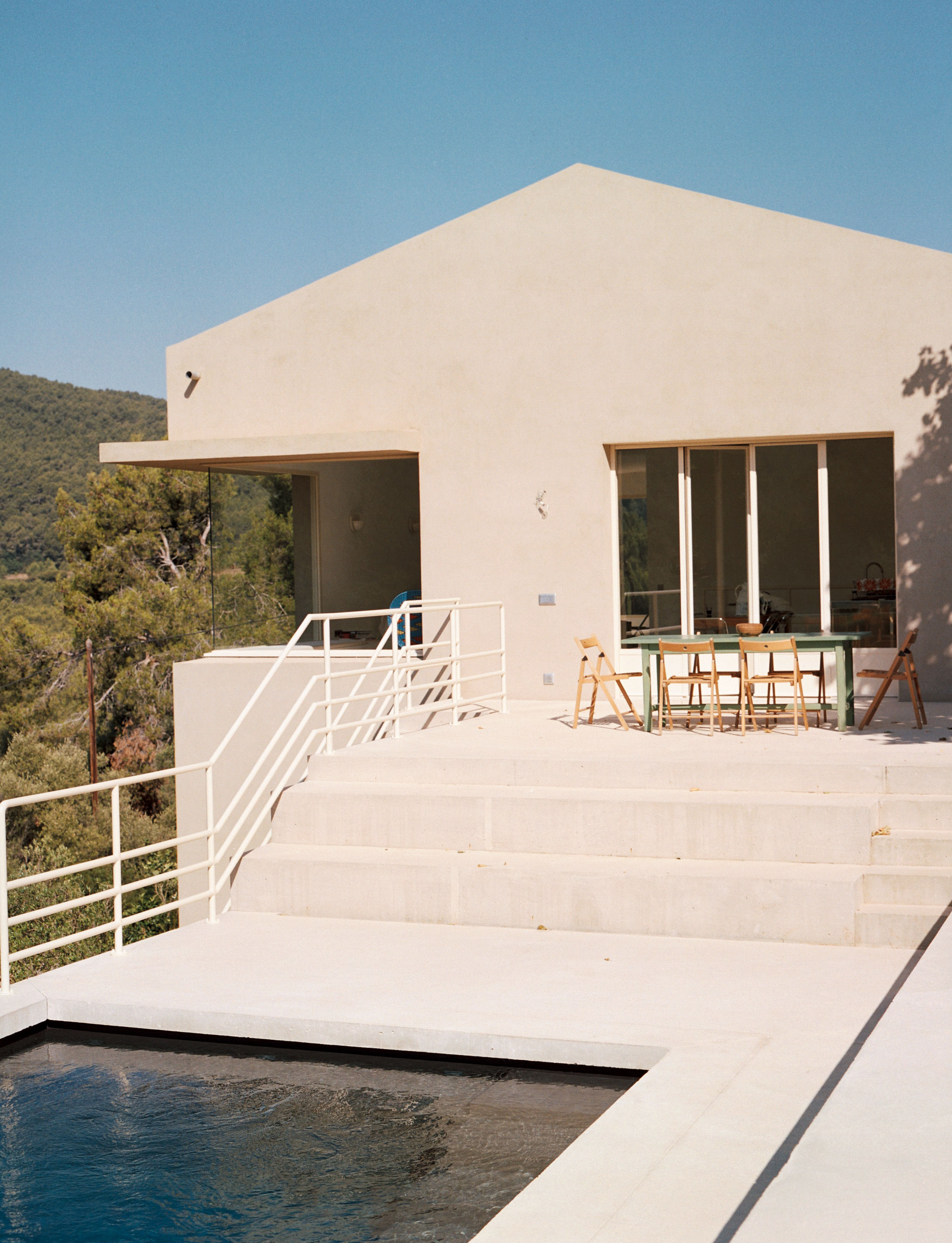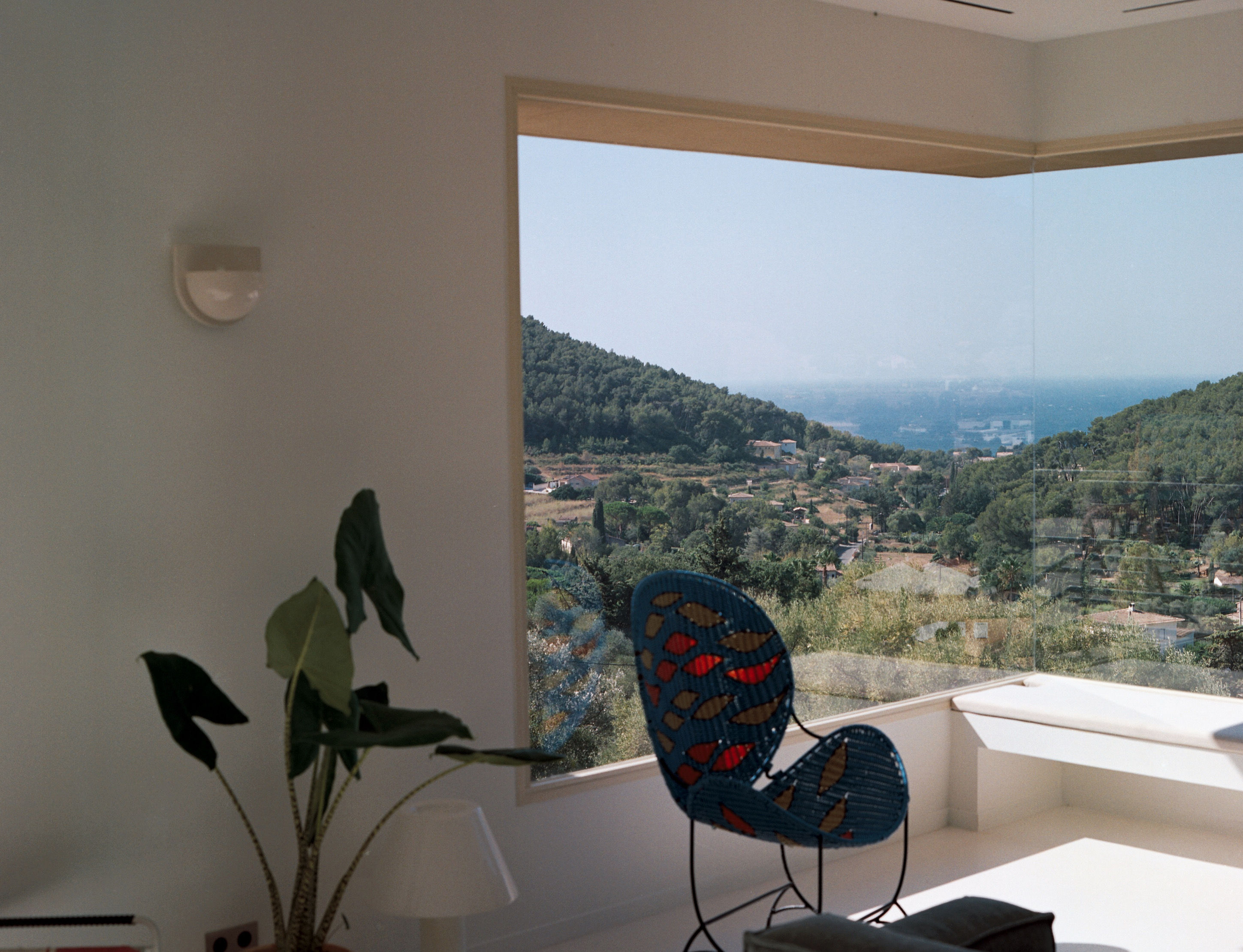 Between Hyères and Toulon, on a hillside dotted with olive groves, pine trees and modernist villas, Villa Anémone offers a hideaway par excellence. The area was once known for its flower fields overlooking the sea—hence the name. Today, the villa’s minimalist, retro-inflected design gestures toward Los Angeles, making it easy to imagine as a place to write a screenplay—or simply to lounge by the pool. Inside, the atmosphere is calm and controlled, from the stainless-steel kitchen to the clean-lined living room. In the bathroom, navy and evergreen tiles mirror the view from the lounge’s distinctive corner window: a deep blue haze of sea in the dip between two wooded hills.