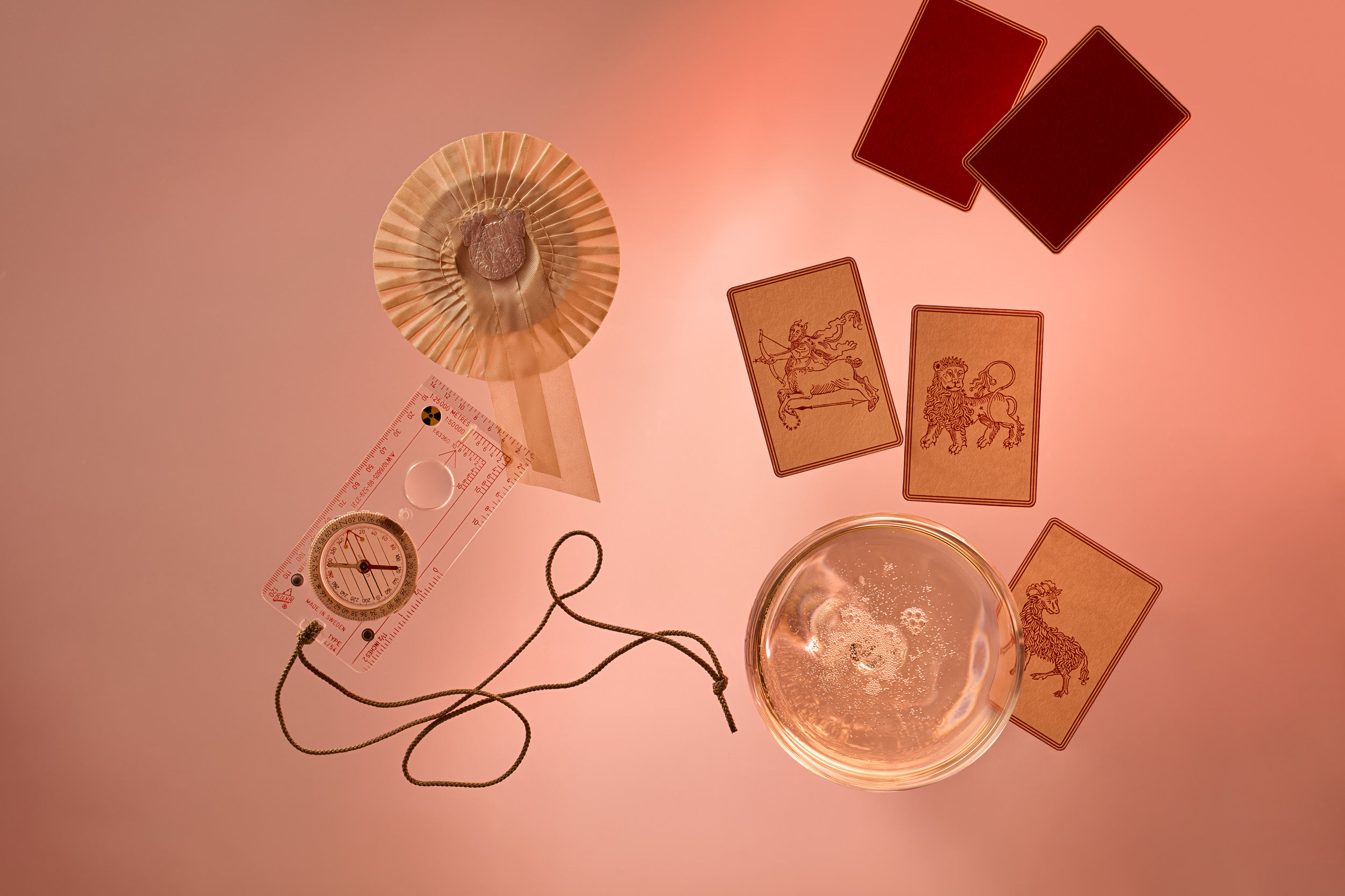 All aflame—The fire signs, represented by a rosette (ARIES; ambitious), a glass of champagne (LEO; decadent) and a compass (SAGITTARIUS; curious).